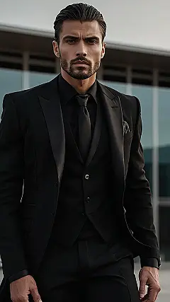 This guy looks super sharp in his all-black suit! He’s got the whole tuxedo thing going on, which is perfect for a fancy party or even a night out on the town. You know what they say, a good suit makes you feel like you can do anything! He even has a fancy watch on to make sure he’s always on time. Maybe he’s going to a special event or a big date – either way, he’s definitely dressed to impress!