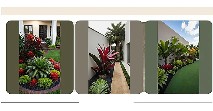 This picture shows a fantastic example of tropical landscape design! It’s like stepping into a jungle, but in a really cool and stylish way. You’ve got these beautiful, red plants that look like they’re straight out of a movie, and a tall palm tree that makes you feel like you’re on a tropical island. And the best part? There’s a pathway that lets you walk through this mini-jungle, so you can really feel like you’re on an adventure!