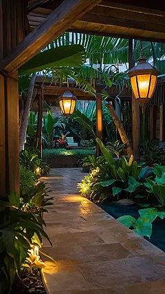 This picture shows a beautiful tropical landscape design that’s perfect for getting lost in. Imagine you’re strolling down that stone path, surrounded by lush greenery and palm trees. The warm light from the lanterns makes it feel like you’re walking through a jungle at dusk. It’s like stepping into a real-life fairytale!