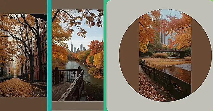The picture shows an aerial view of a New York City park in autumn. Imagine you’re flying over the city in a helicopter, looking down at the trees. You can see all the beautiful colors of fall – deep reds, oranges, and yellows. They paint the city in a stunning picture of nature. It’s like a giant canvas of color, only much prettier.