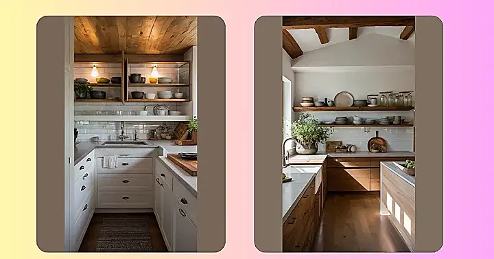 That gorgeous wooden island is surrounded by open shelves brimming with dishes and jars, like a secret treasure trove of yummy things. The whole space feels warm and inviting, like slipping into your favorite sweater after a long day. This isn’t your grandma’s kitchen (unless your grandma is seriously stylish!), but it still has that comforting, homey vibe that just makes you want to bake cookies and hang out.
