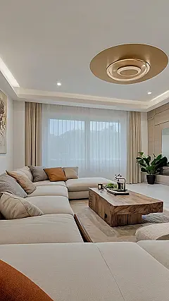 This living room is like a big, comfy hug! It’s all about relaxing and chilling out. The giant white sectional couch looks like it could swallow you whole, but in a good way! It’s perfect for movie nights or just hanging out with your friends. The super-soft pillows look inviting and the giant windows let in lots of light, making the whole room feel bright and airy.