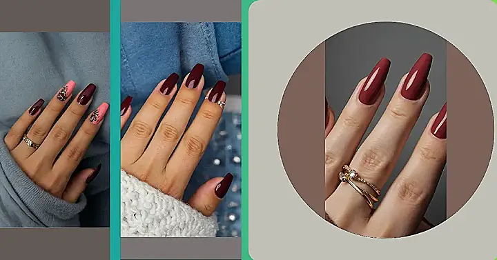 This image is giving serious winter nail inspo! Just look at those gorgeous burgundy nails, the perfect color to keep your hands looking chic even when you’re bundled up in your warmest sweaters. And those sparkly accents? They add a little bit of extra magic that’ll have everyone asking, “Where did you get those nails done?” They’re like the perfect winter accessory – warm, stylish, and just a little bit fancy.