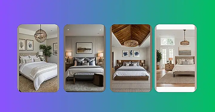 And let’s talk about the cool stuff that makes it pop, like that giant woven ball hanging from the ceiling – it’s way cooler than just a plain light. See the plant too? It’s basically a green roommate that doesn’t steal your snacks. Little things like a unique lamp, some cool artwork, and even a fuzzy rug under your feet can make your master bedroom feel less like just a room and more like your own personal escape pod designed purely for maximum relaxation and looking awesome.
