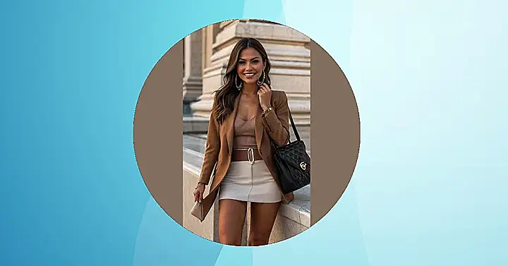 This outfit is perfect for a fall date night, because it’s both stylish and comfy! The brown blazer is a classic look that’s super flattering, and the mini skirt gives it a bit of a sassy edge. Plus, the oversized hoops and the chic bag just add the right amount of “I’m ready for anything” vibes. This outfit is like a warm hug from your favorite sweater, but way more stylish! Imagine strolling hand-in-hand with your crush under the autumn leaves, and you’ll understand why this outfit is a total winner.