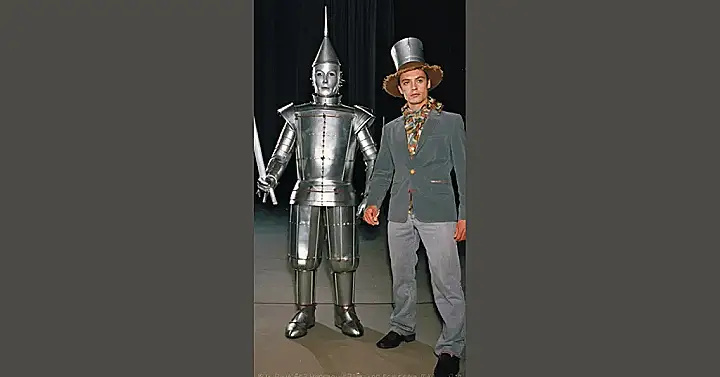 This photo is super cool! It shows the Tin Man, a famous character from the Wizard of Oz, and it looks like he’s got a human friend who is dressed up in a really stylish hat. Imagine being a Tin Man! You would have to be extra careful not to rust and be super careful walking around on those metal feet! The Tin Man is wearing a super cool suit of armor, and it looks like he’s holding a sword. He’s probably ready to fight off any wicked witches!