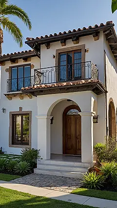 This adorable little Spanish-style home is like something out of a fairytale! Imagine yourself sipping lemonade on that cute balcony, maybe with a fluffy white cat curled up beside you. It’s got all the classic features: the warm terracotta roof tiles, the charming arched doorway, and that beautiful whitewashed exterior that practically glows in the evening light. It’s the perfect size for cozy family gatherings or a quiet getaway, especially if you appreciate a little bit of “olé!” in your life.