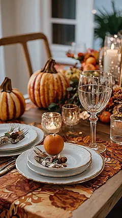 It’s also super interesting how the little details, like the tiny pumpkins on the plates and the elegant wine glass, add a touch of sophistication to the whole setup. Plus, can we talk about how pretty those candles look? They’re the perfect way to add a warm and inviting glow to the table. This is the kind of Thanksgiving tablescape that will make your guests feel like they’ve stepped into a warm, cozy dream. So, get ready to eat, drink, and be merry!