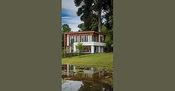 This isn’t just a house; it’s like a fancy treehouse for grown-ups! With all those windows, you can practically high-five the squirrels in the surrounding trees. Plus, you’ll have a front-row seat to nature’s coolest water show in the pond. Just picture yourself sipping iced tea on that little balcony, planning your next epic video game marathon.