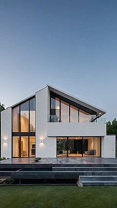 This house looks like it’s straight out of a movie, but with a touch of “I can actually afford this!” vibe. It’s got that cool, modern look with the white walls and big windows, perfect for spying on the neighbors… I mean, enjoying the natural light! Plus, that little balcony looks like the ideal spot for a dramatic reading of your favorite poetry, or maybe just some late-night snacking – your call.