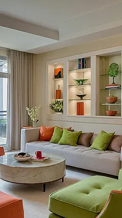 This living room is like the chillest jungle ever! Seriously, check out those green pillows. They’re screaming “nap time” more than your alarm clock on a Monday morning. And who needs a real jungle when you’ve got strategically placed plants in those fancy shelves? It’s basically the sophisticated version of bringing the outdoors in, without having to worry about finding a lost parrot in your curtains.