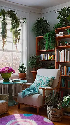 This setup is basically the ultimate excuse for skipping chores. Who could possibly concentrate on folding laundry when there’s a whole bookshelf whispering tales of faraway lands? And with all those plants, it’s like reading in a secret garden, minus the actual bugs. Just remember to occasionally look up from your book and acknowledge the real world – your parents will appreciate it!