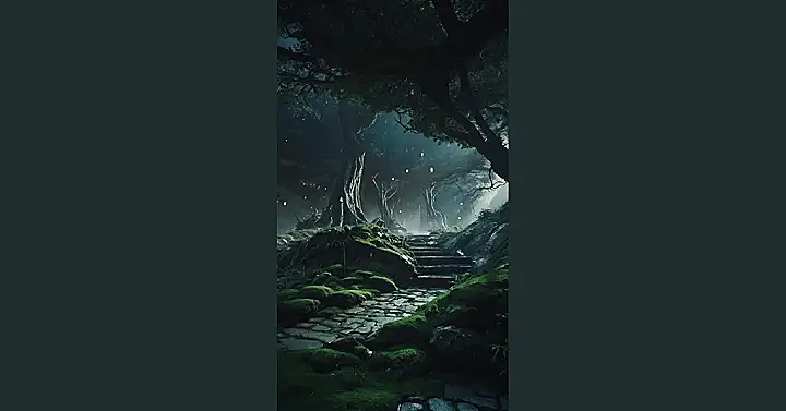 This image is like something straight out of a fantasy novel! Imagine walking through this mysterious forest, with the soft glow of fireflies lighting your way. It’s dark and spooky, but also kind of beautiful, like something a brave adventurer would find on their quest. Those glowing orbs floating in the air, are they magic or something else? I bet you could hear whispers in the wind as you walk along this path.