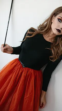 This girl is rocking a super easy and totally stylish last-minute Halloween costume! Just grab a black shirt, an orange tulle skirt, some dark lipstick, and you’re ready to go. She looks like a spooky, mysterious character, maybe even a witch! With a little bit of creativity and a dash of confidence, you can totally nail your Halloween look, even if you’re super short on time. No need to stress over complicated costumes – simple is always best!