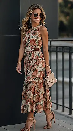 This look screams, “I’m ready for warmer weather, but also ready to run if someone spills their iced latte!” I mean, that dress is floral perfection, but the sneakers keep it real. It’s like saying, “I can rock a fancy garden party, but I’m also down for pizza and Netflix.” Plus, wearing sneakers with a dress is basically a fashion cheat code for comfort. Who wants blisters when you can be cute *and* comfy?