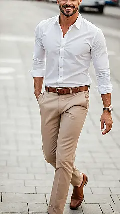 Forget the old rulebook that says you have to stick to boring colors once you hit a certain age. That pop of orange in the shirt is a total game-changer, showing you’re not afraid to stand out (in a good way!). And white pants? They might seem risky after lunch, but when they fit just right like these, they look super sharp and summery. Add a cool belt and some stylish shoes, and bam! You’ve got an outfit that says “I’m experienced, I’m relaxed, and I know how to dress.”