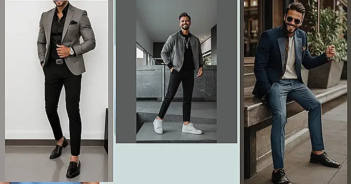 That guy’s got style! He’s rocking a seriously cool casual look – a comfy grey zip-up jacket, sharp pinstripe pants, and clean white sneakers. It’s like he just stepped out of a fashion magazine, but also looks ready to chill with friends. See? You don’t need a tuxedo to look awesome. This outfit is all about that perfect balance of relaxed and refined— proving that casual can still be seriously stylish. It’s the kind of outfit you can wear to a coffee date, a casual hangout, or even a relaxed family dinner.