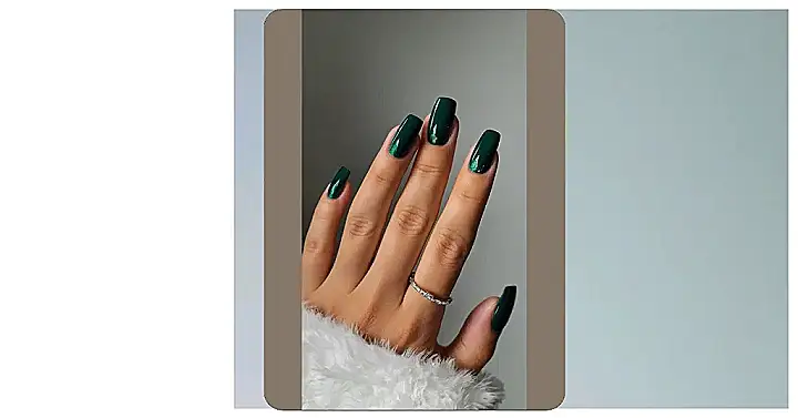 Check out these nails! They’re like little emeralds, sparkling and shining against that gorgeous dark green sweater. It’s the perfect fall look—imagine walking through a forest in autumn, crunching leaves under your feet, and these nails making you feel like you’re part of the scene. Seriously, they’re so shiny and pretty, they almost make you want to lick them (don’t do that, though!).