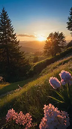 Seriously, who needs a filter? This sunset is already perfect! It’s like Mother Nature decided to throw the best party, with rolling hills as the guests and the sun as the mega-star DJ. The flowers are dancing in the golden light, and the trees are just hanging out, enjoying the show. It’s basically a postcard from paradise – the kind that makes you want to ditch your homework and book a ticket to somewhere ridiculously beautiful.