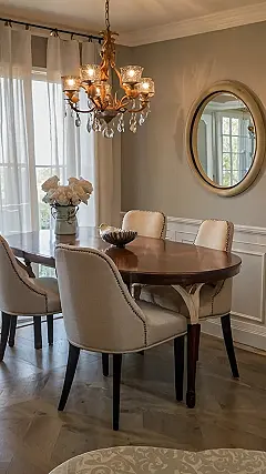 But let’s be real, even the fanciest dining rooms get messy sometimes. I bet after a few family dinners, that elegant table has seen its share of spilled juice and rogue peas! The round mirror adds a nice touch though, maybe you could check your reflection before heading to the kitchen for dessert, making sure you don’t have any tomato sauce on your chin. It’s the perfect blend of elegant and comfortable, ideal for creating lasting memories around the table.