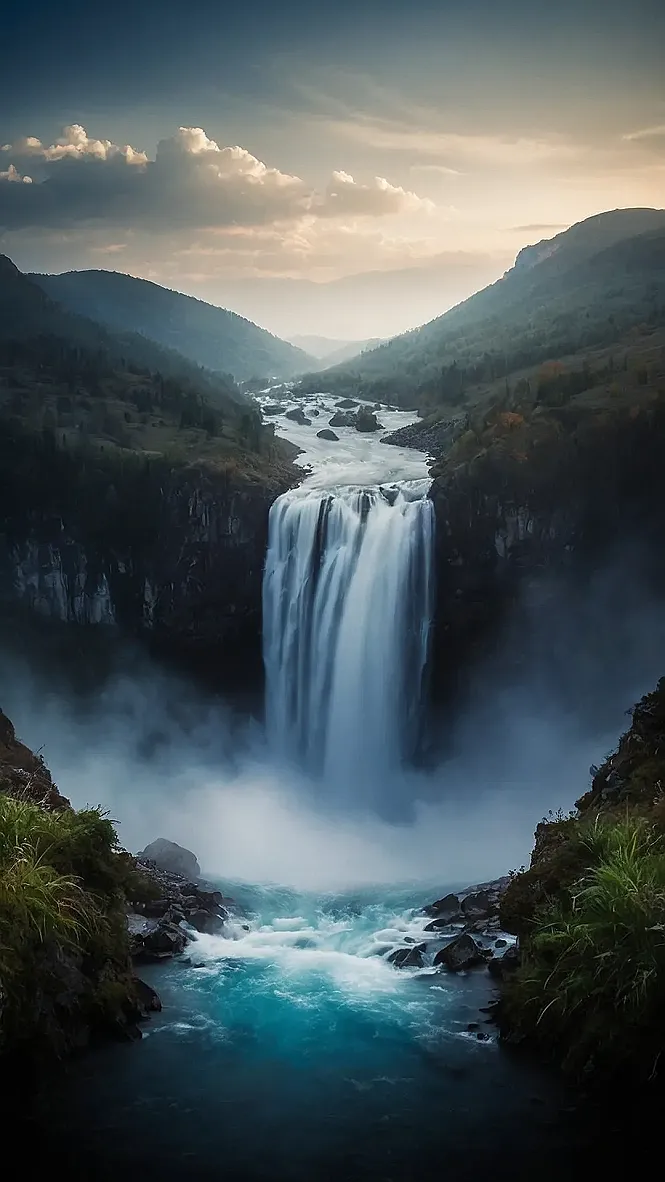This picture shows a waterfall in a mountainous area. The water is crashing down from a tall cliff, and it looks so powerful! It’s like the water is trying to escape from the mountains, but they’re holding it back. I bet it would be super cool to see the water up close, but you’d probably get soaked!