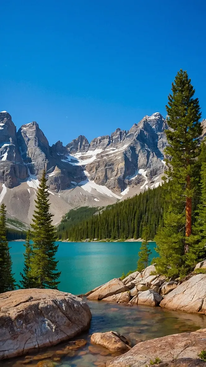 This picture makes you want to jump right into the photo, doesn’t it? The mountains look so peaceful and majestic, like they’re watching over everything. And the lake? It’s so clear and blue, you can almost see the fish swimming around! It’s hard to believe something this beautiful exists, and I bet the air smells amazing there, like pine trees and fresh water. It’s the kind of place you could just sit and chill for hours, watching the clouds drift by and maybe even spotting a cute little squirrel scampering around.