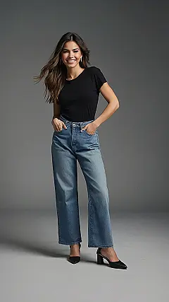 So, you wanna rock the denim look like a supermodel? Check out these jeans! They’re like the “cool kid” of pants – always stylish, and they go with practically anything. The girl in the picture is totally owning it with that white top and those fancy shoes, proving that jeans can be dressed up or down. Plus, denim is tough stuff, so you can actually do stuff in them, unlike that delicate skirt you wore that one time!