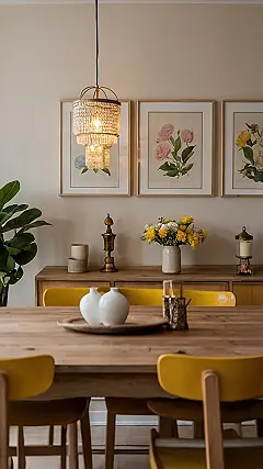 This dining room is seriously giving us major “adulting” vibes, but in a totally chill way. Imagine having dinner here – the gorgeous wooden table, those sunny yellow chairs, and that super-stylish chandelier that’s like, a sparkly cloud hanging above your head. It’s all so sophisticated, but also cozy and welcoming. You could totally picture yourself studying here, or just hanging out with your friends. The floral artwork adds a perfect touch of nature, a little bit of elegance without being stuffy.