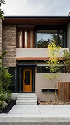Look at this house! It’s like the architectural version of that one kid in school who always dressed super stylish, but somehow made it look effortless. The straight lines and mixed textures give it a serious “I’m modern and I know it” vibe, but the little plants and that warm wooden door make it feel welcoming. You could totally imagine a super-chill family living here, maybe with a robot dog or a self-watering garden.