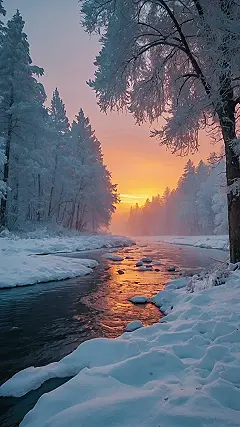 This picture is like something out of a fairytale! The snowy trees lining the riverbanks look like they’re straight out of a Christmas card. The sun is setting, painting the sky with amazing shades of orange and pink, and its reflection in the water is just magical. It looks like a place where you could wander around for hours and get lost in the beauty of nature.