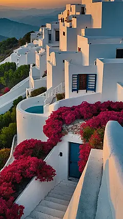 Wow! Just look at this place! It’s like something out of a fairytale, all white buildings clinging to a hillside, bathed in the golden light of sunset. It’s the kind of luxury place you’d see in a magazine, perfect for those amazing “luxury places photography” shots. I bet the photographers are having a field day capturing the stunning views and the vibrant, almost ridiculously gorgeous, bright pink flowers spilling down the steps. It’s enough to make you want to pack your bags and move in immediately!