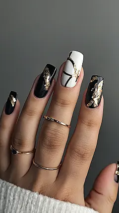 These nails are like a fancy party for your fingertips! They’re black and white, but not in a boring way. Think of it like a classy outfit with a sprinkle of gold confetti – that’s what the gold flakes look like. It’s like someone took a piece of shiny wrapping paper and smashed it onto their nails – but in a really stylish way!