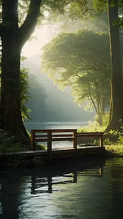 This picture is like a postcard from a fairy tale, only way cooler. Imagine yourself strolling through a forest so peaceful, it’s practically whispering secrets to the trees. The air is misty and soft, like a giant, fluffy cloud decided to hang out near a calm river. You reach a little wooden bridge, perfect for taking a selfie (or maybe just enjoying the view), and the water is so still you can almost see your reflection smiling back at you. It’s the kind of place where your worries float away on the gentle current, like a tiny, slightly soggy, but very happy, leaf.