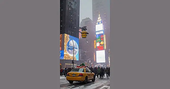 The snow is falling like confetti, making everything look a little bit magical. The taxi is driving through the snow, probably on its way to pick up someone who’s going to a Christmas party. The big Christmas decorations on the taxi make it clear that this is no ordinary ride; it’s a festive journey through the heart of New York City during the holidays. You can almost hear the Christmas carols playing in the background, and smell the delicious scent of hot cocoa and roasted chestnuts.