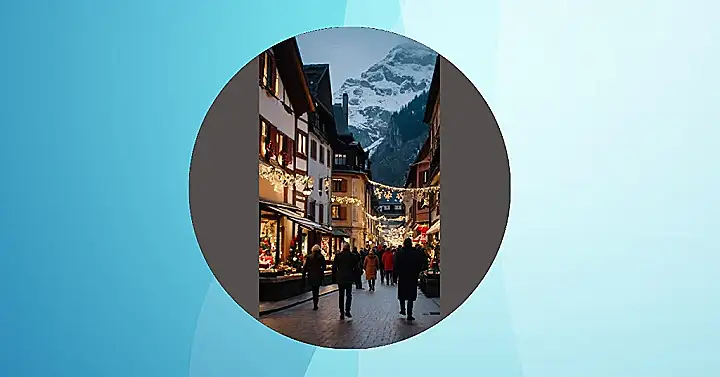 The picture shows a street in Europe, all decked out for Christmas. The buildings are cozy and charming, with twinkling lights strung up like a giant, sparkly necklace. You can even see a huge mountain in the distance, covered in snow, like a giant white frosting on a giant gingerbread cake. It looks like people are out and about, enjoying the festive atmosphere. They’re probably heading to a warm shop to buy some hot cocoa and maybe even some gingerbread cookies! It looks like the perfect Christmas scene, right?