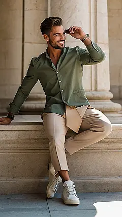 This guy looks like he just strolled out of a magazine, right? He’s got that “I just threw this on” vibe, but you know it took him at least 20 minutes to decide which casual shirt and pants combo looked the most effortlessly awesome. Check out the relaxed button-down and those perfectly creased trousers. This is proof you can totally rock looking put-together without feeling like you’re headed to prom.