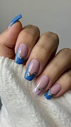 These nails are totally rocking the “blue valentine nails design” vibe! Imagine getting these done for Valentine’s Day – you’d be the coolest person at the school dance, way cooler than the kid who brought a box of chocolates. The sparkly V-shaped accents are like mini-glittery fireworks exploding on your fingertips, adding a touch of elegance that’s totally unexpected with the fun blue and pink combo. Plus, they’re way more interesting than plain red nails, right?