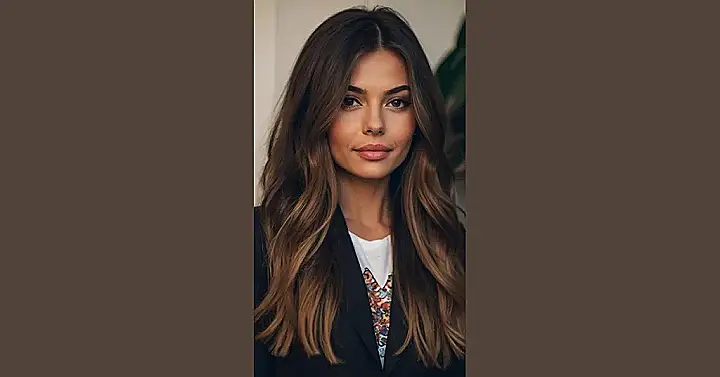 Want to spice up your brunette hair without going totally wild like that time your mom tried to dye her hair purple? Well, subtle changes can make a big difference. Check out how the model in the picture has gorgeous highlights that brighten up her whole look! Those soft, caramel-like tones add dimension and make her hair look super healthy and shiny. It’s like a little sun-kissed magic for brunettes!