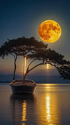 This picture is like a postcard from a super chill place! Imagine a giant, glowing orange moon hanging out above a peaceful lake. There’s this little boat all alone, looking like it’s ready for a super relaxing evening cruise. It’s almost like the moon is shining its magical light specifically for this tiny boat and it’s the most peaceful wallpaper ever! Those trees leaning over the water are like nature’s own welcoming committee, totally saying “come on in, the water’s fine (and the moon is huge!).”