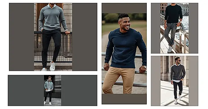 Hey there, fashion-forward friend! So, you’re looking at “men’s smart casual outfits,” huh? This picture totally nails it. See that guy? He’s rocking a dark sweater – super comfy but still looks sharp. Pair that with some cool grey jeans (notice the slight distressing – adds that relaxed vibe without looking messy), and bam! Instant style upgrade. Think of it like this: it’s the outfit you’d wear to a casual Friday at work, but also to grab coffee with your friends afterwards. No need for a tuxedo, just effortlessly cool.