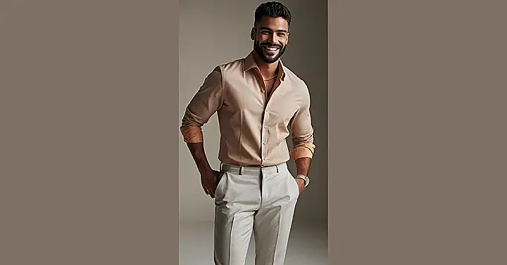 This guy knows how to rock a classic men’s clothing style! It’s like he walked straight out of a vintage fashion magazine, but with a modern twist. The light brown shirt and matching pants are super clean, and you just know he’s got the confidence to pull off those cuffed sleeves. He’s definitely got that “I woke up like this” vibe, even though he probably spent a good 10 minutes on his hair.