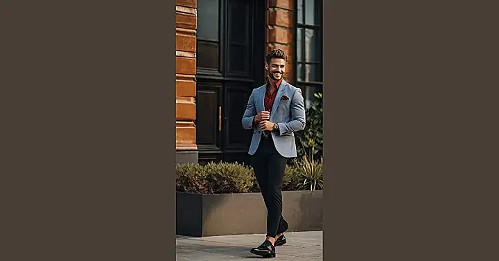 This guy’s outfit is seriously festive! Imagine rocking up to your Christmas party looking this dapper. That plum-colored blazer is like a grown-up version of Christmas wrapping paper – sophisticated and stylish. The beige pants are the perfect neutral, keeping the focus on that awesome blazer. It’s the kind of outfit that will make you feel like you could charm the socks off Santa himself!