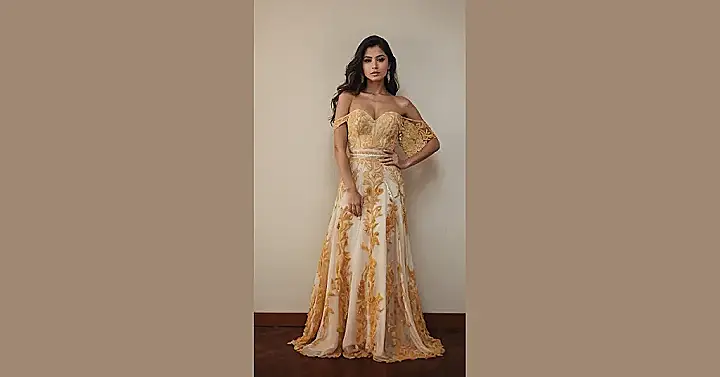 This dress is like a walking garden! The floral pattern looks like it’s made of gold, it’s super fancy. It’s a maxi dress, meaning it’s long and flowy like a princess’s gown. Imagine twirling around in this dress, feeling like you’re on a catwalk! It’s totally perfect for a special occasion, maybe a prom or even a wedding!