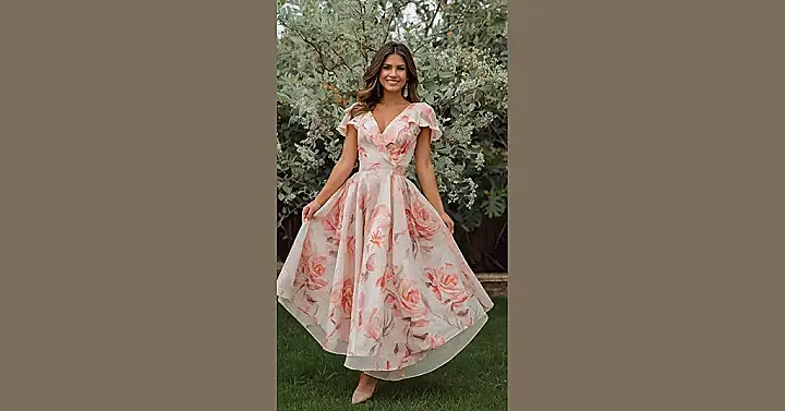 This isn’t your grandma’s floral print! Check out this gorgeous dress – it’s like a walking garden party. The model looks absolutely stunning, doesn’t she? Imagine twirling in this beautiful frock, feeling like a princess in a fairytale. It’s the perfect blend of elegance and fun, ideal for a garden wedding, a summer picnic, or just because you deserve to feel fabulous.