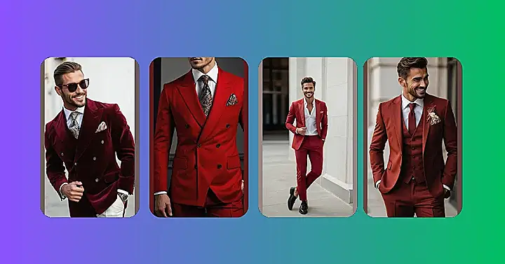 This guy’s rocking a seriously snazzy men’s red suit! It’s like a superhero costume, but instead of fighting crime, he’s probably just conquering the world of amazing style. That shade of red is bold, it’s confident, and let’s be honest, it’s way more fun than your average boring grey suit. He looks like he’s ready for a fancy party, a red-carpet event, or maybe even a very stylish game of hide-and-seek (because who wouldn’t notice him in that suit?).