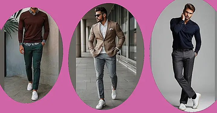 This guy’s totally rocking the corporate casual look! Forget stuffy suits – a maroon sweater over a patterned shirt is way more interesting. Those forest green pants are seriously stylish, and the white sneakers? They’re the perfect touch of relaxed cool. It’s like he’s saying, “I’m professional, but I also know how to have fun.” He’s basically the poster child for how to look sharp without feeling stiff.