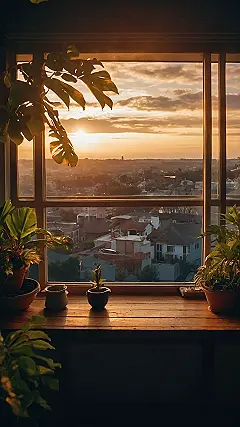 This picture is like a real-life anime wallpaper! Imagine a character from your favorite show, maybe a shy magical girl or a brooding samurai, gazing out this window at the gorgeous sunset. The warm glow on the plants and the city below is totally Instagrammable, and it’s just the kind of peaceful scene you’d find in a relaxing anime moment before a big battle or a heartfelt confession. Those little potted plants are totally rocking the cozy vibe too, they’re like miniature anime characters themselves!