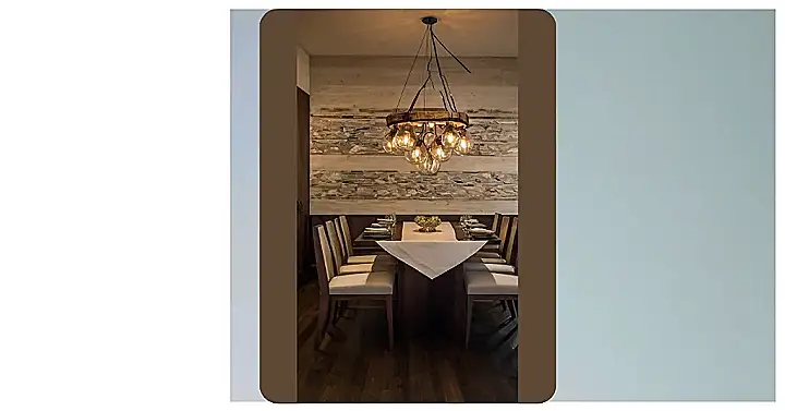 The stone and wood wall gives off a super chill vibe, making the whole room feel cozy without being stuffy. You could totally imagine having a fun family dinner in here, where no one is allowed to talk about homework, and everyone has to tell at least one hilarious story. And if things get too real, just stare at the chandelier; it’s like a hypnotic collection of glowing bubbles!