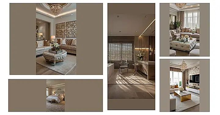 This living room isn’t just fancy; it’s like stepping into a sparkly, grown-up fairytale. Imagine sinking into those unbelievably plush sofas after a long day, maybe with a giant mug of hot cocoa. The chandelier is absolutely dazzling ‚Äì it practically screams “lavish home decor,” doesn’t it? And those gold wall pieces? They look like some super-cool, artistic puzzle pieces. You could totally get lost in this room just admiring the details!
