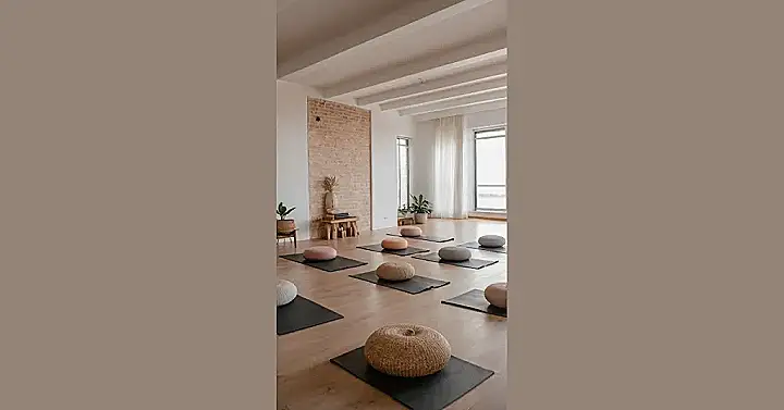You know how sometimes your brain feels like it’s running a million apps at once – homework, social media drama, what to eat next? This room in the picture is like the ultimate anti-chaos chamber. Look at it! Those calm colors, the soft glow from the log candles (don’t try this with actual logs at home, probably!), and the rows of mats just waiting for you to ditch the stress. It’s basically screaming, “Come find your chill!” Finding a mindful space like this is like hitting the pause button on your day, giving your brain a much-needed break from the constant notifications and reminders that your socks don’t match.